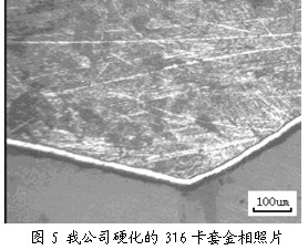 對于不銹鋼卡套式管接頭,卡套用奧氏體不銹鋼制造,但由于奧氏體不銹鋼的硬度偏低(~230Hv),在擠壓力下,卡套首先發(fā)生塑性變形,卡套在不銹鋼管的表面嵌入深度較淺,密封效果不好,往往一次裝配合格率不會高于60%。目前國外進(jìn)口的不銹鋼卡套都是經(jīng)過表面硬化處理,如美國的Swagelok公司和PARKER公司、日本JSK品牌不銹卡套接頭。Swagelok 公司是世界著名的卡套生產(chǎn)商,該公司利用LTCSS技術(shù)對奧氏體不銹鋼卡套表面進(jìn)行硬化處理,硬化前,卡套表面要先用HCl進(jìn)行表面活化處理,去除不銹鋼表面的鈍化,然后進(jìn)行470℃氣體滲碳處理,整個處理周期長達(dá)幾十個小時,以獲得硬度600-1000HV、厚度大于25μm 的硬化層(見圖3、圖4)。